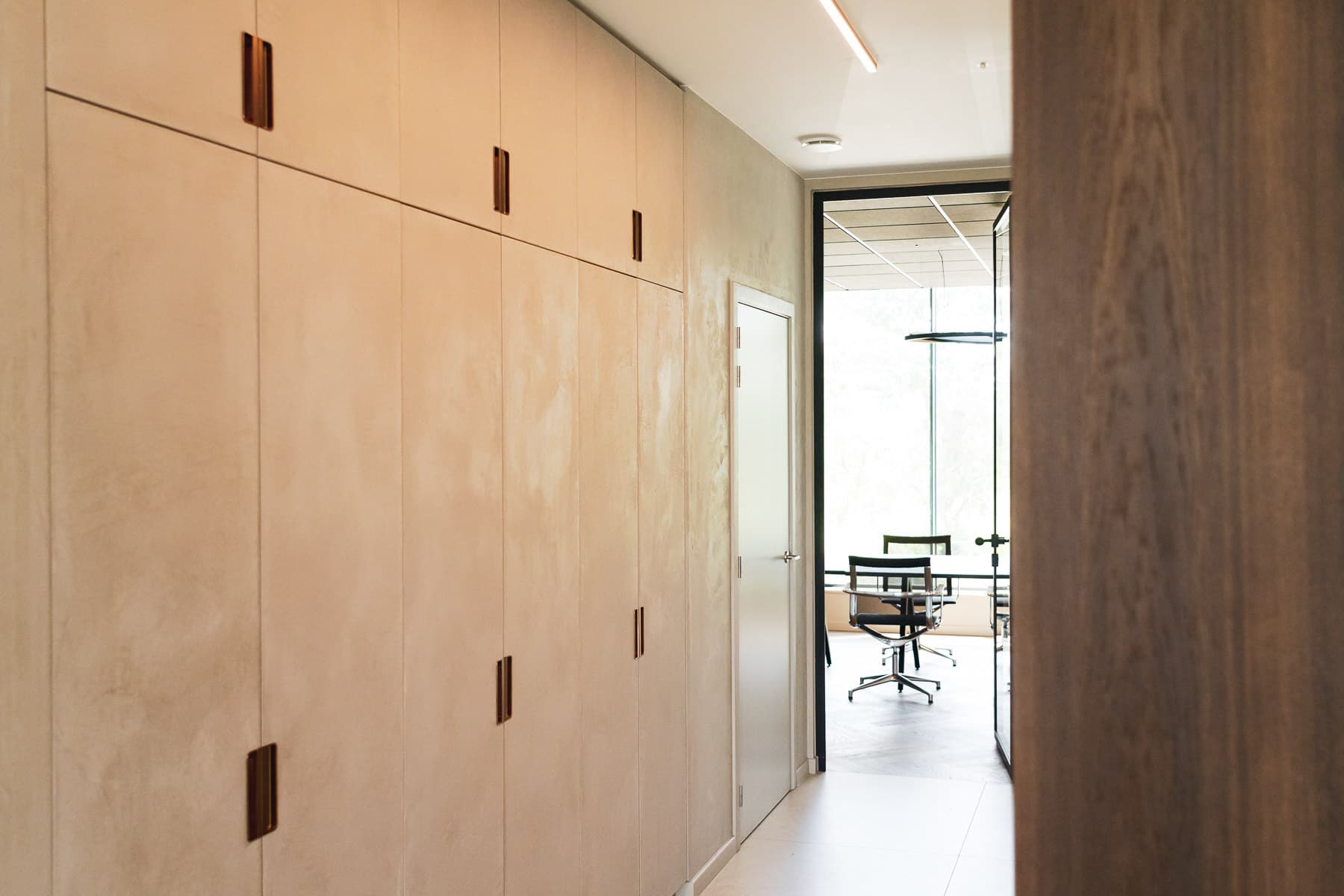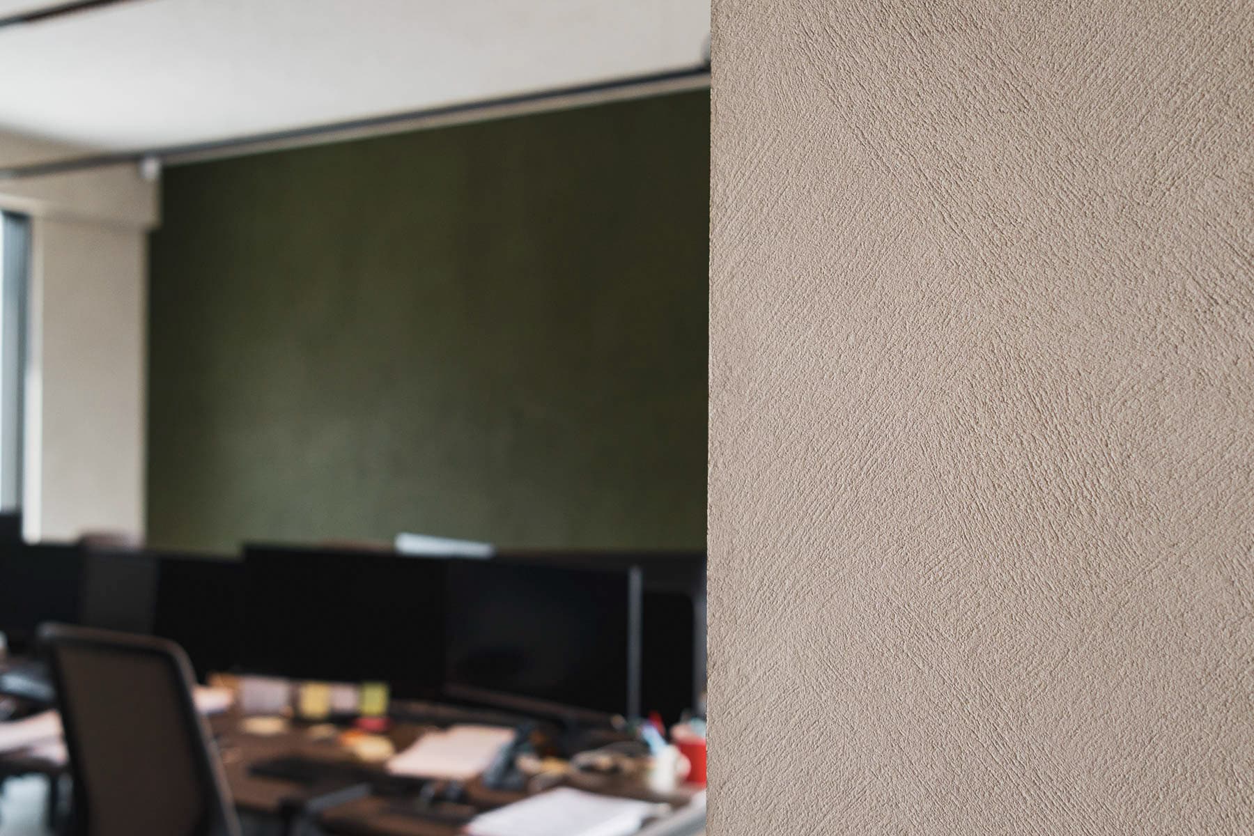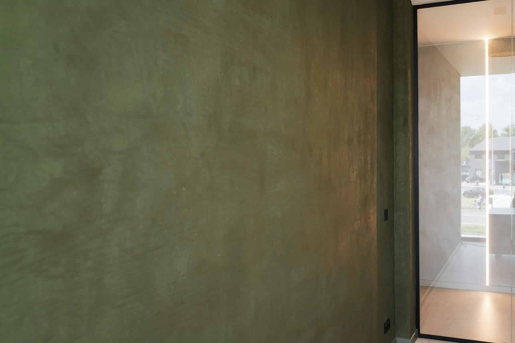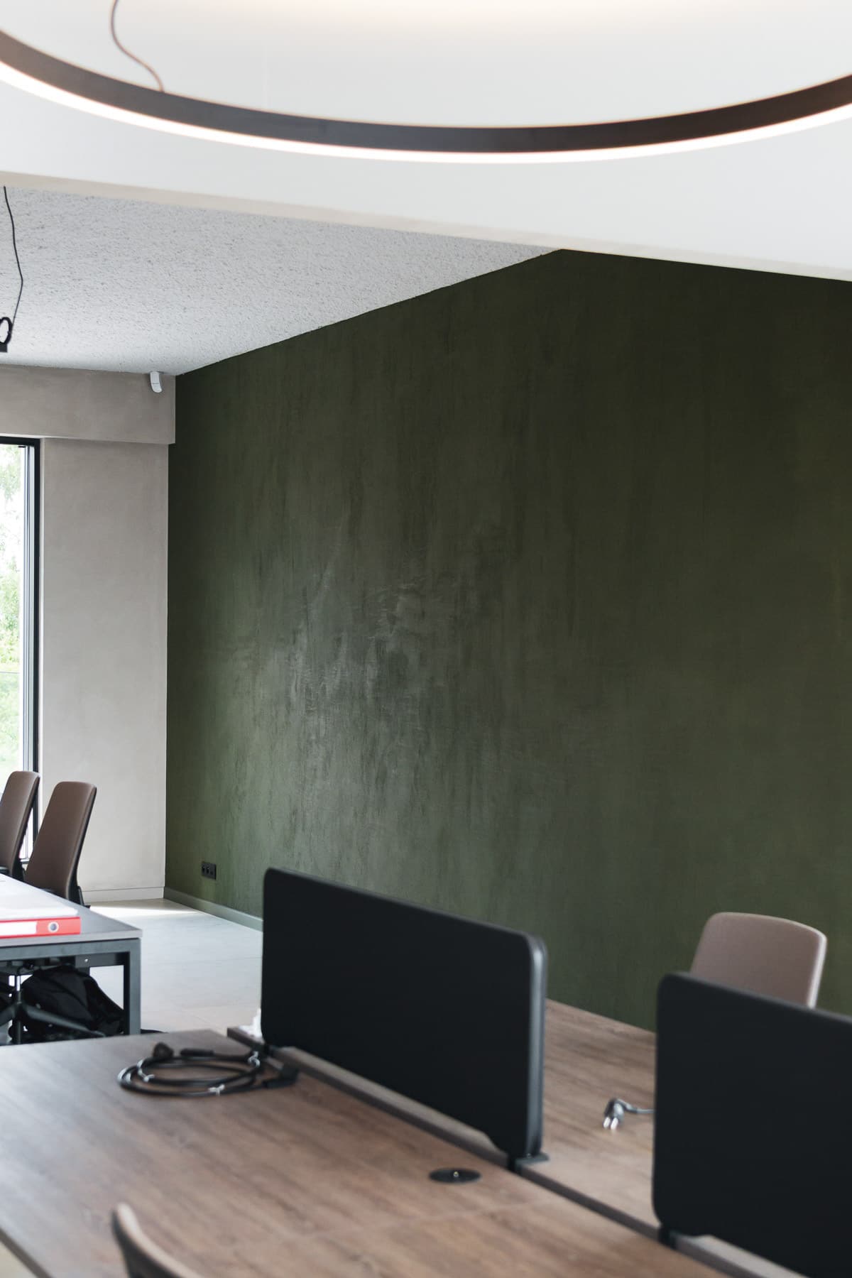 Bij studiebureau Igenia in Zottegem showcasen we enkele bijzondere decoratieve afwerkingstechnieken. Op het maatmeubilair brachten we Thalostuc Origin aan van Odilon Creations voor een sprekende look & feel. Op de groene bureauwand brachten we Thalostuc Xarraca aan, en op de palen en contour van het landschapskantoor pronkt de Thalixe techniek, eveneens van Odilon Creations. Het barmeubel op het verdiep erboven werd afgewerkt met Mortex. Het resultaat? Een karaktervol kantoor waar je met alle plezier gaat werken.