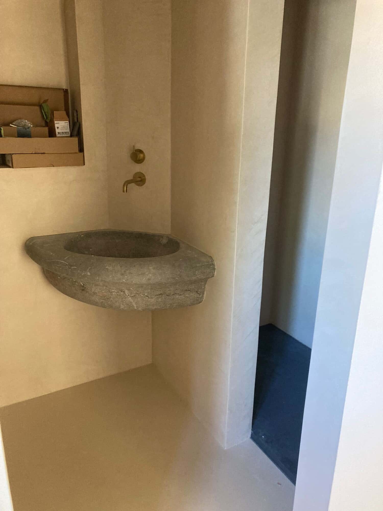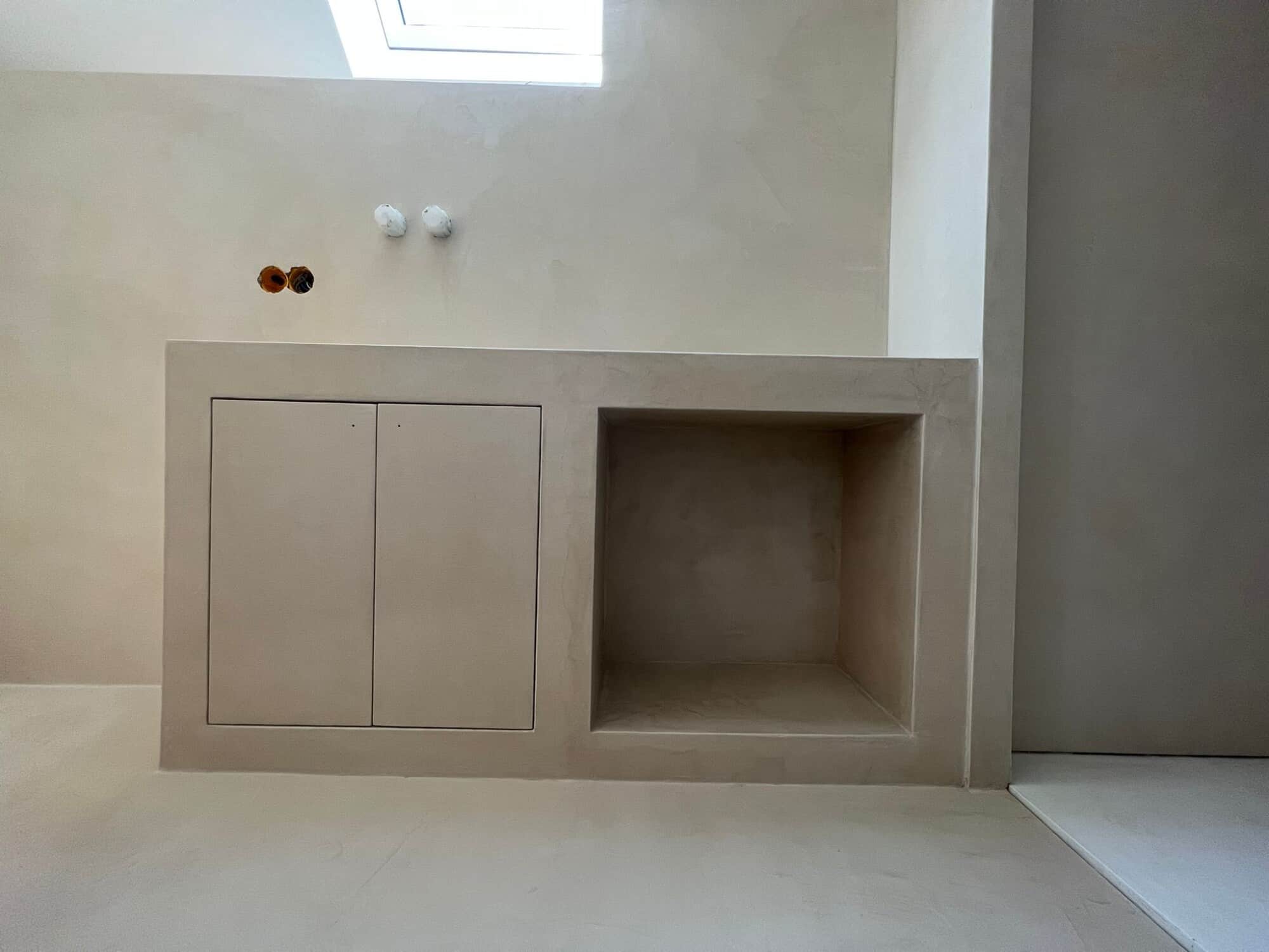 Precies daarom kozen we voor mortex. Niet alleen de vloer en wanden van de badkamer kregen een minerale look, maar ook de meubels werden in hetzelfde jasje gestoken. Ook het onderhoudsvriendelijke aspect van mortex was hier van belang.
